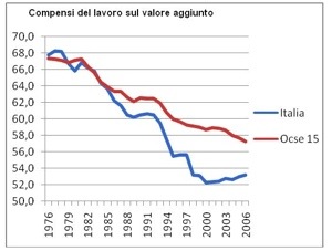 La forte diminuzione della quota dei redditi da lavoro dipende in larga misura dall’evoluzione del salario reale. Secondo le stime del rapporto dell’ Organizzazione Internazionale del lavoro, a parità di potere di acquisto, gli stipendi reali sono diminuiti in Italia del 16% circa tra il 1988 e il 2006. In Italia la quota del reddito nazionale che si ottiene attraverso il lavoro è la più bassa tra i paesi che stiamo confrontando:
