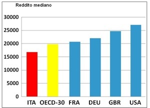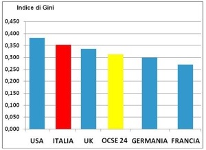L’Italia risulta avere un alto indice di Gini, inferiore solo a quello degli USA. Germania e Francia hanno invece un indice di Gini inferiore alla media di 24 paesi dell’OCSE.