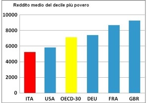 Confrontando i redditi mediani, quelli del decile più povero e quelli del decile più ricco della popolazione mettiamo in luce la gravià della situazione italiana. Infatti, l’Italia ha I redditi minori rispetto la media OCSE e mentre sia per il reddito mediano che per il reddito del 10% più povero l’Italia è l’ultima tra i paesi considerati, il reddito del 10% più ricco risulta più alto rispetto alla media OCSE, anche rispetto alla Francia. Si tratta di un dato che mostra in modo inconfutabile lo squilibrio che il nostro paese vive, con conseguenze molto rilevanti sia sul piano sociale che economico.