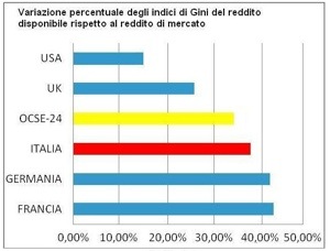 Secondo i dati OCSE in Italia l’effetto dell’intervento dello stato sulla diseguaglianza nella distribuzione dei redditi è superiore a quello dei paesi anglosassoni e alla media OCSE. Tuttavia risulta sensibilmente inferiore a quello della Germania e della Francia. L’Italia però si situa agli ultimi posti nell’efficacia distributiva dell’intervento pubblico. E’ necessario capire quanto la scarsa efficacia redistributiva dell’intervento dello stato sia dovuta all’alta evasione fiscale e agli sprechi nella spesa pubblica e quanto dipenda dalla struttura stessa della tassazione e dei trasferimenti. Dalle elaborazioni dell’ OCSE risulta in particolare che la progressività dei trasferimenti, e di conseguenza il loro impatto redistributivo, è molto minore in Italia rispetto alla media degli altri paesi, tanto per quanto riguarda le persone in età da lavoro che per gli anziani.