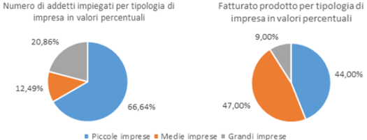 I dati relativi al fatturato mostrano che le grandi imprese producono il 9% del totale mentre le piccole il 44% e le medie il 47%. I grafici seguenti raffigurano quanto appena detto: