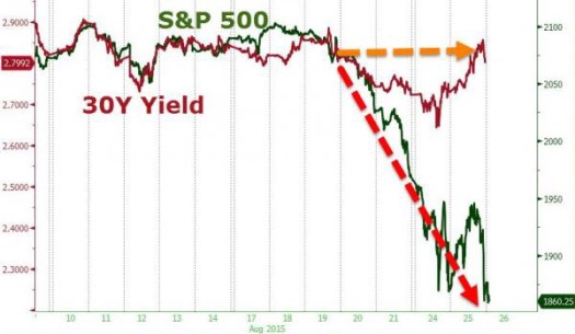 Le ultime due settimana sono state caratterizzate dalla crisi cinese, alta volatilità sui mercati e la diminuzione sostanziale del prezzo del petrolio. La Cina inoltre al iniziato un piano di iniezione della liquidità per sostenere i mercati tagliando i tassi ben 5 volte nell’arco dell’anno, svalutando lo yuan e e soprattutto vendendo Treasuries. Si stima che nelle ultime due settimane siano stati venduti ben 100 miliardi di titoli americani. I rendimenti dei Treasuries sono calati nell’ultime settimane, in altre parole sia l’indice S&P e sia il trentennale amaricano, anche se di solito sono incorrelati, sono scesi come si vede dal grafico sottostante. Il grande switch del secolo è iniziato, il grande vantaggio che hanno avuto gli Stati Uniti sta incominciando a svanire. Il debito americano forse verrà immesso sui mercati dalla Cina e forse non sarà più comprato così massicciamente e porterà a nuovi equilibri a livello di riserve.