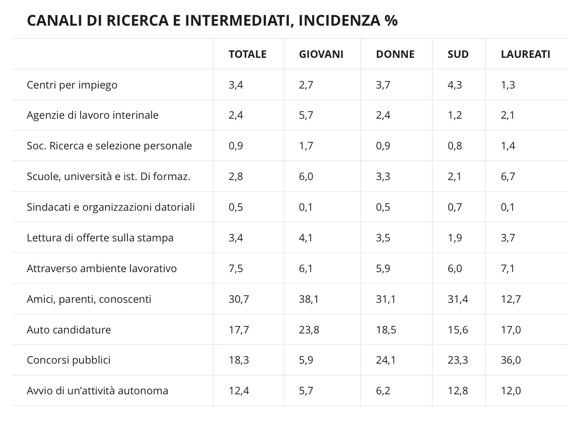 disoccupazione ma soprattutto di scoraggiati all’interno del sistema. I dati redatti dall’Isfol evidenziano la mancanza di efficienza e di funzionamento dei centri del l’impiego, basti pensare che 3 persone su 10, 4 giovani su 10 dai 15-29 anni, trovano lavoro solo tramito canali alternativi quali conoscenze o parenti. Per quanto riguarda i laureati, solamente 1 su 10 utilizza i centri per l’impiego per cercare lavoro.
